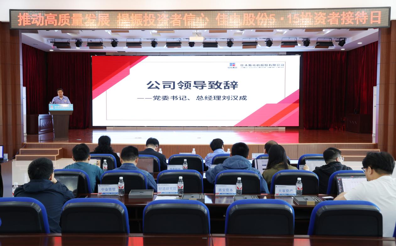 為全面貫徹落實(shí)黨的二十大精神,落實(shí)中央金融工作會(huì)議和新“國九條”相關(guān)部署,積極推進(jìn)上市公司投資者保護(hù)宣傳工作,根據(jù)黑龍江省證監(jiān)局《關(guān)于開展2024年“5?15全國投資者保護(hù)宣傳日”活動(dòng)的通知》要求,5月15日,哈電集團(tuán)佳木斯電機(jī)股份有限公司(以下簡稱“佳電股份”)組織開展了以“向‘新’轉(zhuǎn)變 向‘質(zhì)’而行”為主題的投資者接待日活動(dòng),方正證券、中信證券、華安基金、宏道投資等近30余家機(jī)構(gòu)投資者走進(jìn)公司進(jìn)行交流互動(dòng)。佳電股份黨委書記、總經(jīng)理劉漢成出席會(huì)議并致辭,佳電股份總會(huì)計(jì)師韓思蒂、副總經(jīng)理鄭偉、動(dòng)裝公司黨委委員賈允參加活動(dòng)并圍繞主要產(chǎn)品、未來發(fā)展等方面內(nèi)容與投資者進(jìn)行了深入交流,佳電股份董事會(huì)秘書王紅霞主持會(huì)議。
