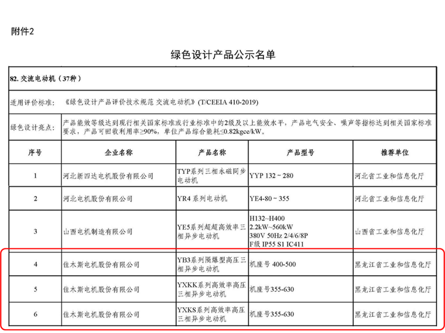 2021年12月, 3個系列高壓電機產(chǎn)品獲得國家“綠色設計產(chǎn)品”稱號,IE5系列電機機企業(yè)產(chǎn)品標準獲得國家企業(yè)標準“領跑者”稱號,該標準中規(guī)定的效率是目前國內最高效節(jié)能隔爆型異步電動機產(chǎn)品,效率值超過最新的國家能效標準1級指標要求。受此認證,佳電股份將被納入萬家用能單位的采購推薦名單,作為綠色電動機產(chǎn)品被鼓勵優(yōu)先采購。